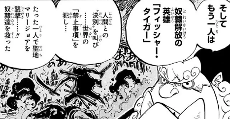 フィッシャー・タイガーはマリージョアに到達したあと、天竜人の奴隷たちを解放し、魚人族及び人魚族に加え、長年魚人族を虐げてきた人間の奴隷たちも差別することなく解放したことから英雄となりました