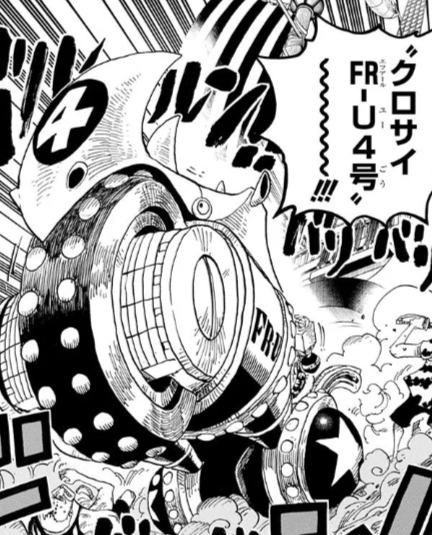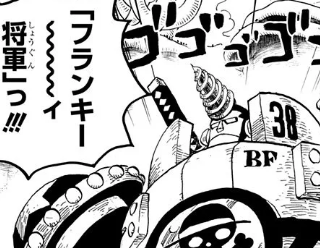 フランキーが少年時代から作り続けているバトルフランキーシリーズの1つである事を表す『BF』の文字を冠した『BF38』の文字が付いており、腹部には自身が所属する麦わらの一味の海賊旗のマーク(麦わら帽子を被った髑髏)が描かれています。