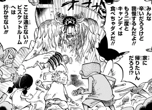ランブルボールで変身したチョッパーが子ども達を止めようとしましたが攻撃できないためやられてしまいました