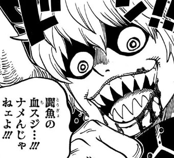 闘魚と人間の半魚人で、魚人族の血によりツノが発現し、帽子に書かれたマークはその闘魚を模しているといわれています